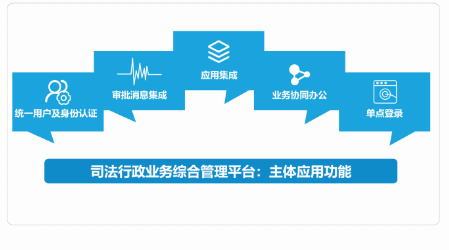 一体整合司法行政职能范围内覆盖的各类业务应用系统,内嵌统一身份认证及用户管理体系,对机构、工作人员、用户进行统一认证和管理,在提升系统认证安全性的同时,极大程度降低基层对于基础数据维护的工作量;集成办公和业务系统等各类审批消息,实现统一窗口获悉本人待处理所有事务的目标,并能一键到达事务处理页面。