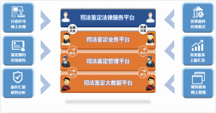结合司法部顶层规划思路和多年来司法鉴定信息化实践经验,我们将涉及司法鉴定业务的信息化应用,从物理上划分为两大部分,一个对外提供司法鉴定法律服务,一个对内整合鉴定所应用、行政管理应用以及大数据分析应用,实现司法鉴定信息化领域的大平台共享、大系统共治、大数据慧治。